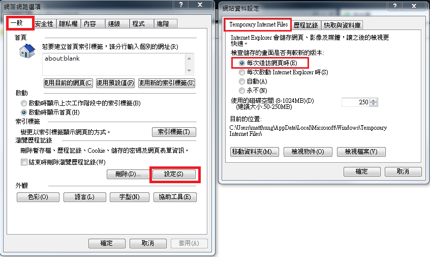設定方式如下,網際網路選項(Internet options) -> 一般(General)頁籤 -> 點選瀏覽歷程紀錄的設定 -> Temporary Internet Files頁籤 -> 勾選 每次造訪網頁時(Every time I visit the webpage)。