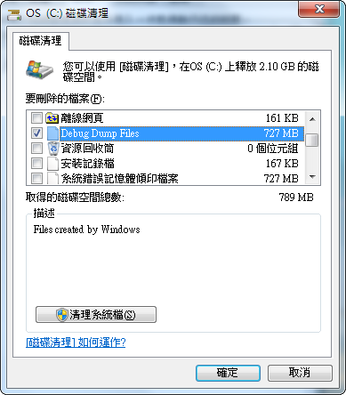 當磁碟空間不夠時,通常會使用Windows內建的磁碟清理工具(Disk Cleanup)清除不必要的檔案來釋放更多的硬碟空間。而選項中有一個Debug Dump Files,這些檔案在系統當機時會產生,在系統當機時,作業系統會複製記憶體資料並產生Debug Dump Files,技術人員可透過Debug Dump Files來找出當機的原因。