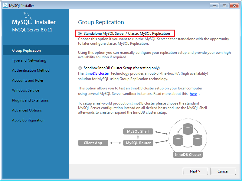 Group Replication維持預設的Standalone MySQL Server / Class MySQL Replication。
