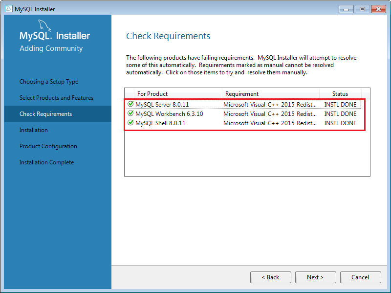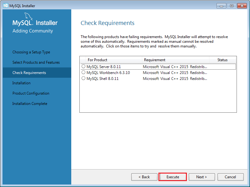 第四步為Check Requirements,此步驟會檢查MySQL會用到的一些軟體,例如 Microsoft Visual C++ Redistributable Package。點選Execute安裝。