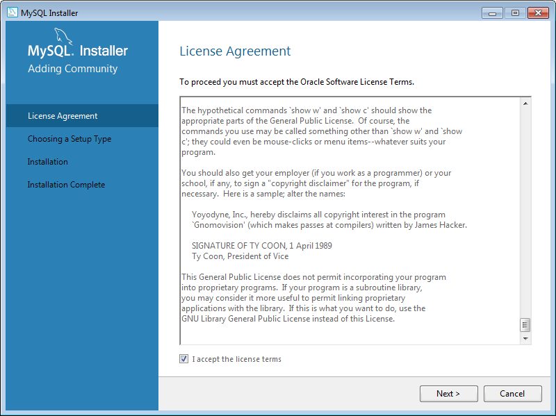 下載好後執行,安裝畫面如下。第一步License Agreement勾選I accept the license terms然後按Next >。