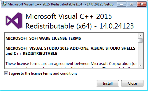 接著開始下載Microsoft Visual C++ Redistributable然後進入安裝畫面,勾選同意並按Install安裝。