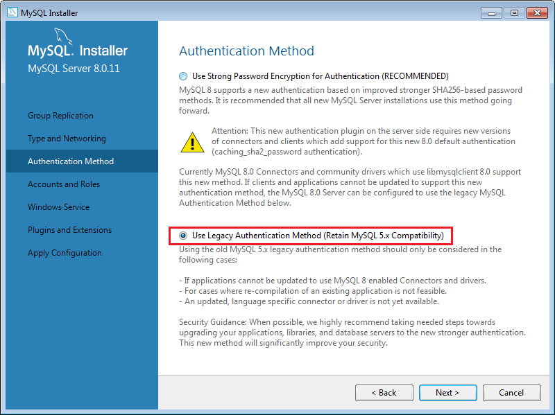 Authentication Method選擇Use Legacy Authentication Method(Retain MySQL 5.x Compatibility)。