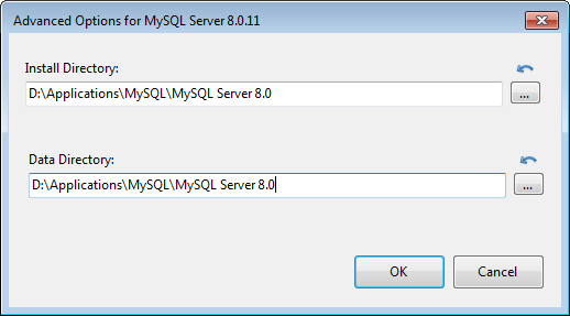 預設安裝路徑為C:\Program Files\MySQL\,但本範例將以上安裝於D:\Applications\MySQL\下。要修改安裝目錄先點選產品,然後點Advanced Options即可修改。選擇好後按Next >。