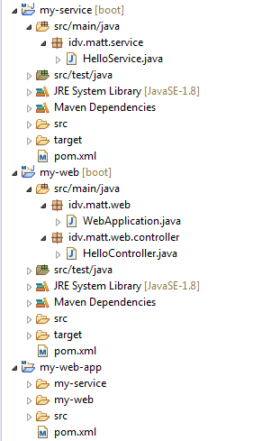 my-web專案與my-service專案都是spring boot應用程式。my-web專案中只有controller,負責接收request;my-service專案則提供my-web專案controller所需呼叫的服務。簡單說就是把一個傳統Web App專案中controller,service切成兩個模組專案。