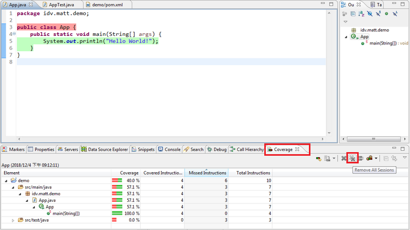 Eclipse Java程式碼覆蓋率(Java code coverage) plugin執行後會出現的highlight顏色效果,如要清除此效果可在Coverage視窗(Coverage View)的功能選單上找到[Remove All Sessions]的叉叉按鈕,點選即可移除。