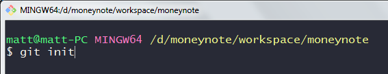 安裝Git Bash工具,然後開啟並將所在目錄移至moneynote專案的存放目錄,也就是D:\moneynote\workspace\moneynote,然後輸入git init指令來將此目錄初始為git repository。