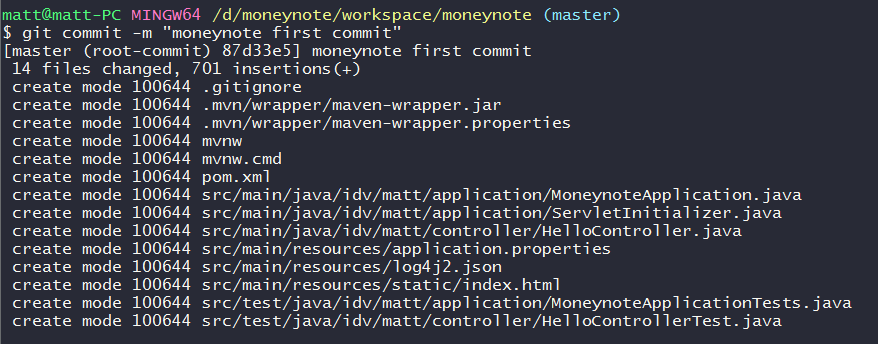 安裝Git Bash工具,然後開啟並將所在目錄移至moneynote專案的存放目錄,也就是D:\moneynote\workspace\moneynote,然後輸入git init指令來將此目錄初始為git repository。