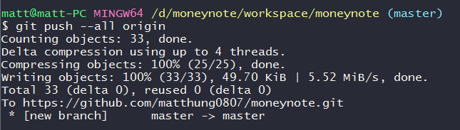 輸入git push --all origin將本地分支的狀態推送(push)到Github的repository。
