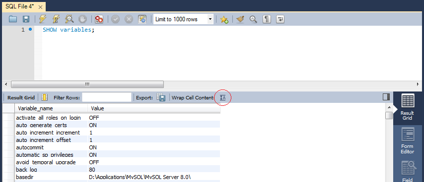 如果你在MySQL Workbench查詢出的結果的列(row)高太窄導致文字的一部分被遮蔽了,就按上圖那個[Wrapping cell contents]按鈕就可以調整了。
