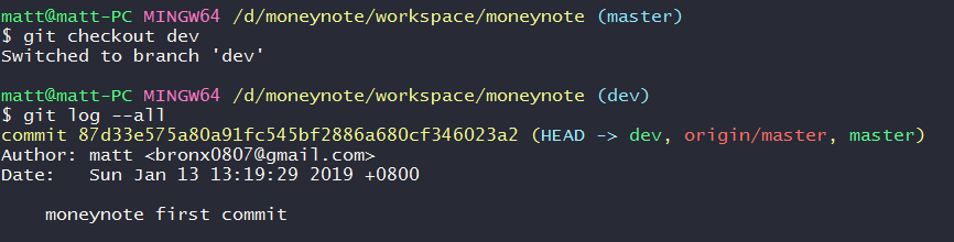 先在git開一條新的branch,名稱為"dev",開啟git bash輸入git branch dev