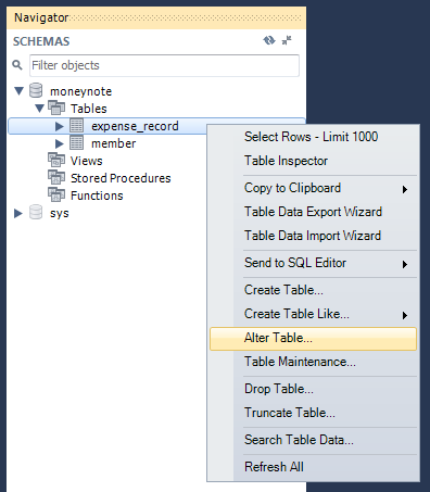 開啟MySQL Workbench,在[Navigator]視窗中,滑鼠右鍵點選expense_record -> Alter Table...。