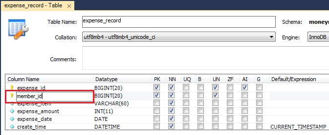 在expense_record的修改視窗中將member_member_id名稱改為member_id,然後按Apply完成。