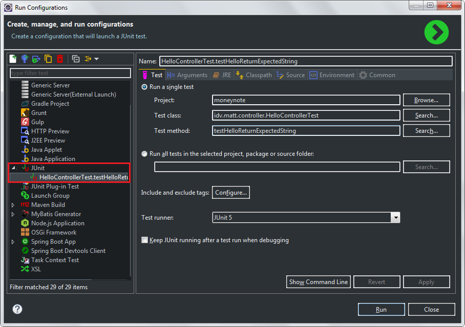 上面設定分別在spring-boot-starter-test中加入對JUnit的排除設定,也就是<exclusion>的部分;及加入JUnit 5的依賴。