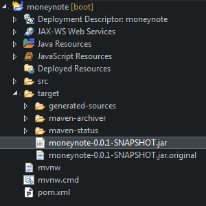打包結束後重新整理專案目錄,在專案根目錄下的target資料夾中可以看到moneynote-0.0.1-SNAPSHOT.jar,此即為spring-boot-maven-plugin重新打包的可執行jar檔;另外一個moneynote-0.0.1-SNAPSHOT.jar.original則為原本的jar檔。