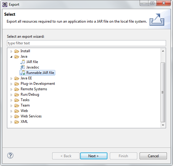接著在Eclipse上方的功能選單選擇File -> Export...,然後點選Java目錄下的Runnable JAR file,然後按Next >。