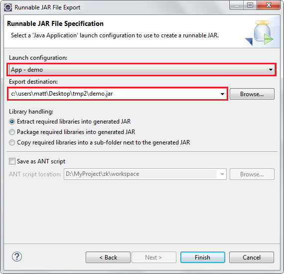 在[Launch configuration]選擇剛剛執行的紀錄。在[Export destination]選擇jar檔的輸出位置。最後按Finish。