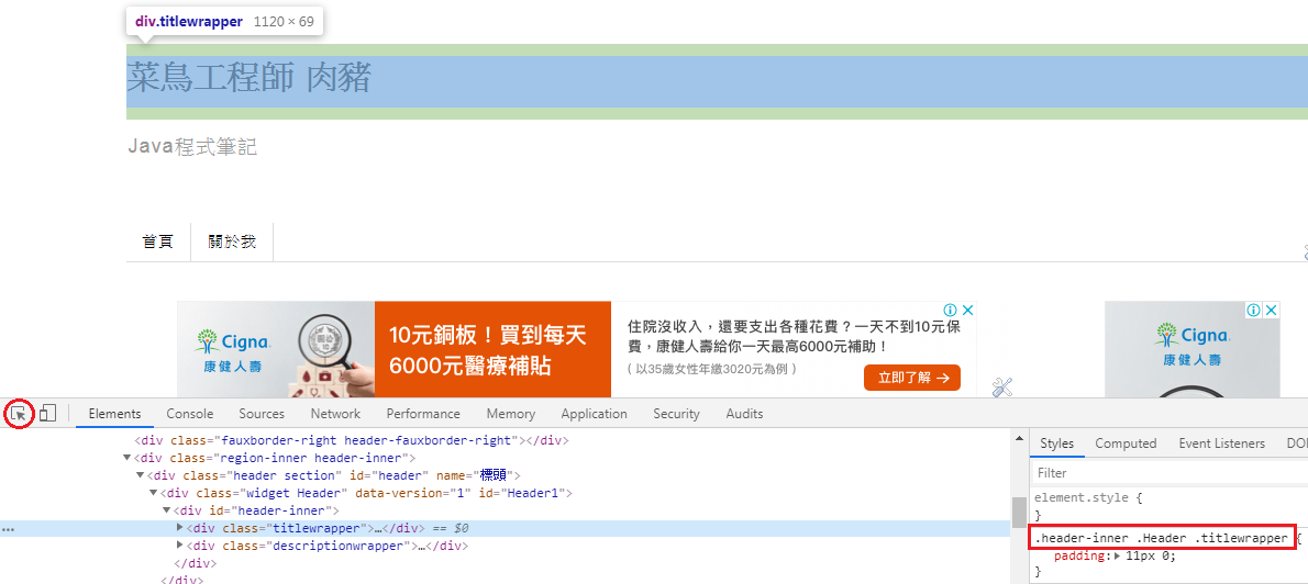 當滑鼠移到網誌標題時,在下方的開發人員工具的[Element]頁籤下可看到被選擇的HTML元素,而右側的[Style]視窗可看到該HTML元素目前套用的CSS樣式。