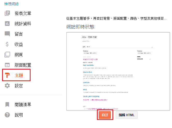 在Blogger後台的功能選單選擇[主題],然後點右邊的[自訂]進入Blogger主題設計工具。