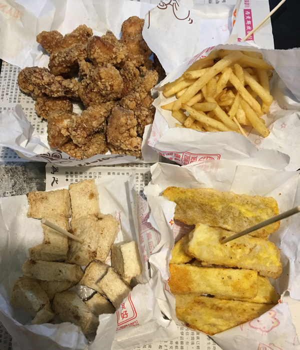 我比較愛吃鹽酥雞(50),點了兩份。所以我今天沒有點炸雞腿或炸雞塊,還另外點了百頁豆腐(30),地瓜薯條小份(30),馬鈴薯條小份(20)共四樣,全部這麼多只花了180元。