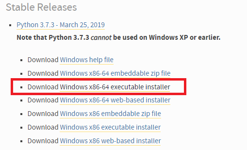 我的作業系統是Windows 7 64 bit版本,所以下載的版本為Python 3.7.3 64 bit版本。