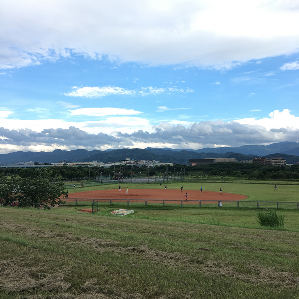 沿途河岸有不少棒球場,小朋友在打棒球。