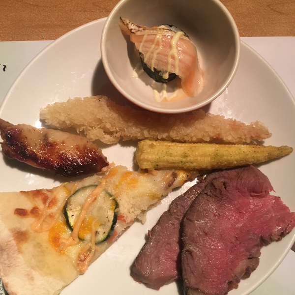 烤牛肉,明太子披薩,烤小玉米,烤雞翅,炸蝦天婦羅,再來個炙燒鮭魚壽司。