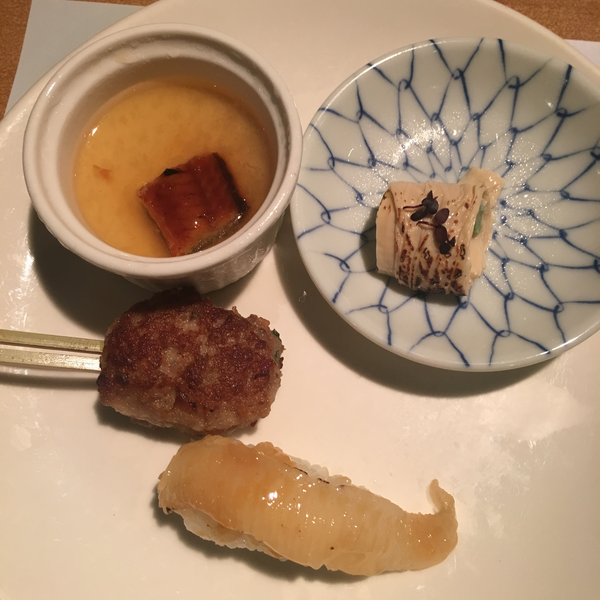 左上的是鰻魚豆腐。右邊的是什麼豆皮裡面包得好像是豆子的東西,下面的炙燒蝶魚油脂香氣很多。