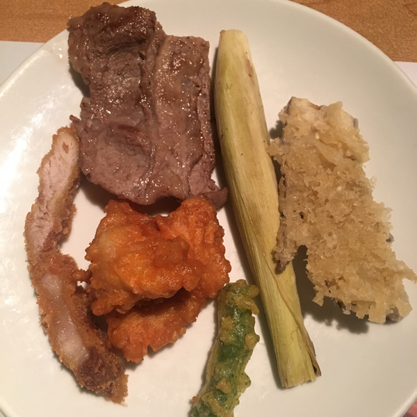 烤牛肉,明太子披薩,烤小玉米,烤雞翅,炸蝦天婦羅,再來個炙燒鮭魚壽司。