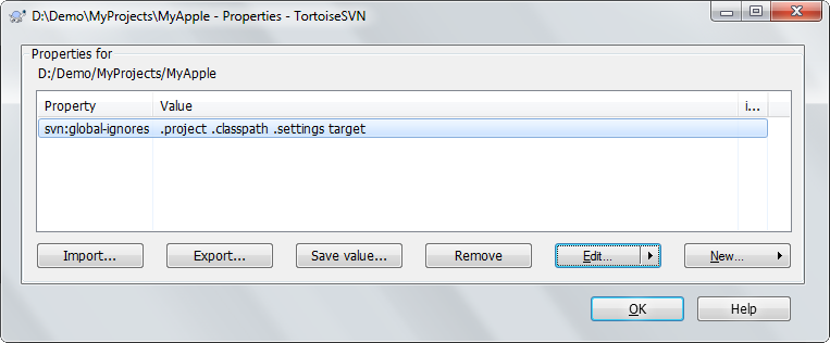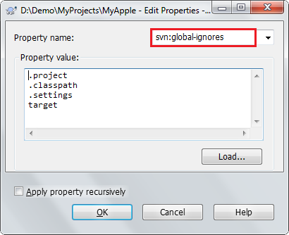 在右上角下拉選單選擇svn:global-ignores,然後在下方欄位填入要忽略的檔案或資料夾.settings,.project,.classpath,target,然後按OK。