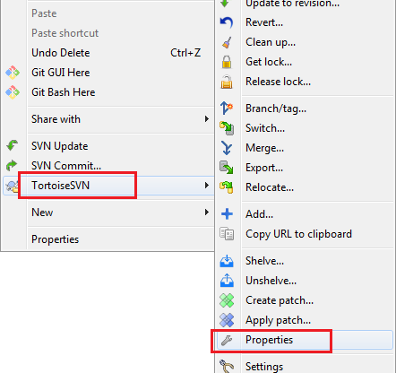 接著在專案資料夾按滑鼠右鍵 -> TortoiseSVN -> Properties