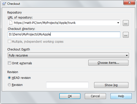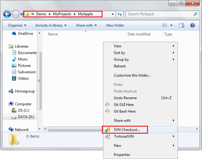 在D:\Demo\MyProjects\MyApple按滑鼠右鍵 -> SVN Checkout...開啟Checkout視窗。