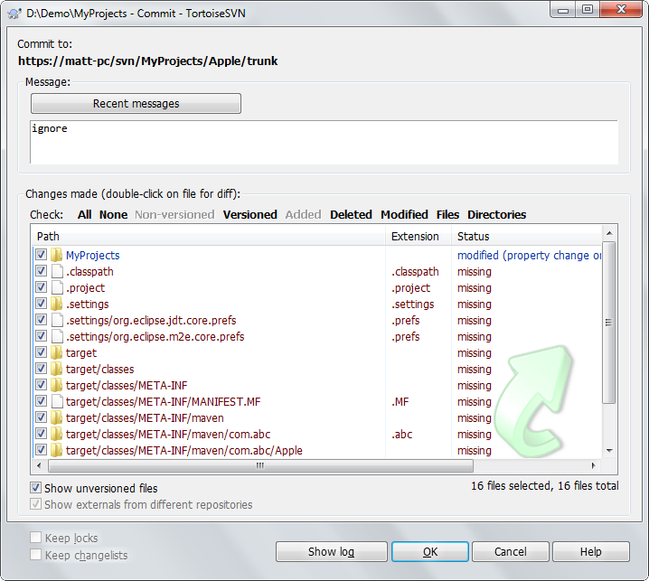 接著我們要將把刪除的檔案及新增的svn:global-ignores屬性的變動提交到專案的SVN repository。狀態(status)為missing的那些檔案就是被刪除的.settings,.project,.classpath及target目錄下的檔案。