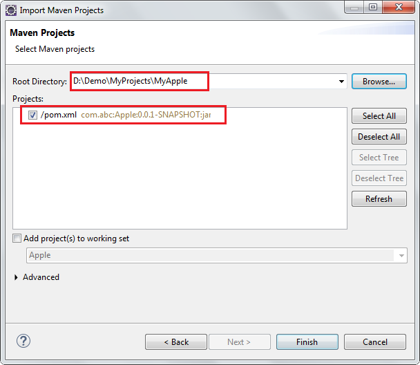 [Root Directory]欄位輸入checkout的目錄位置,也就是D:\Demo\MyProjects\MyApple,然後按Finish