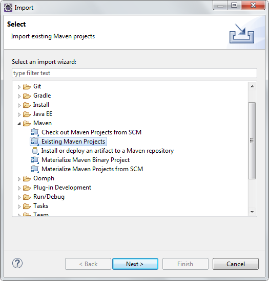 接著打開Eclipse,在功能選單選擇File -> Import... -> Maven -> Existing Maven Projects。
